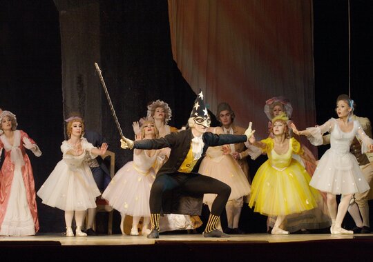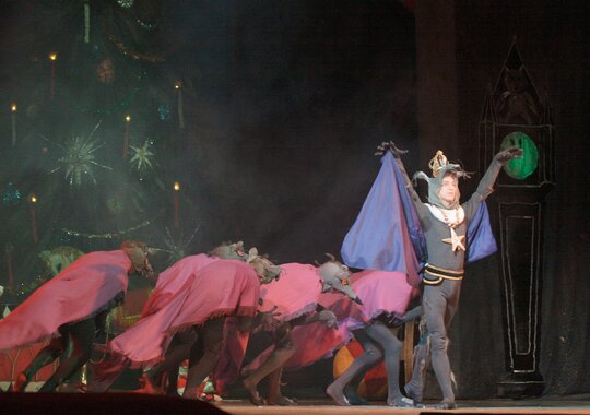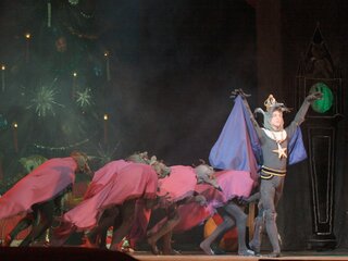 И… в это время появляется Дроссельмейер. Это уже не просто добрый крестный, это — чародей. По мановению его руки все вокруг преображается: стены раздвигаются, ёлка начинает расти. Вместе с ней оживают и растут игрушки.