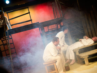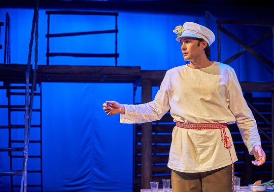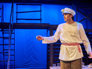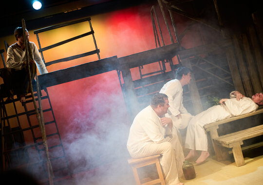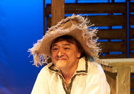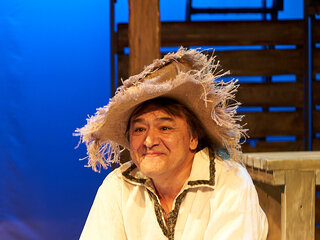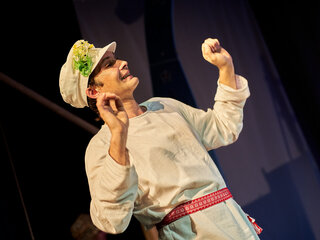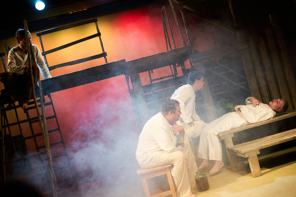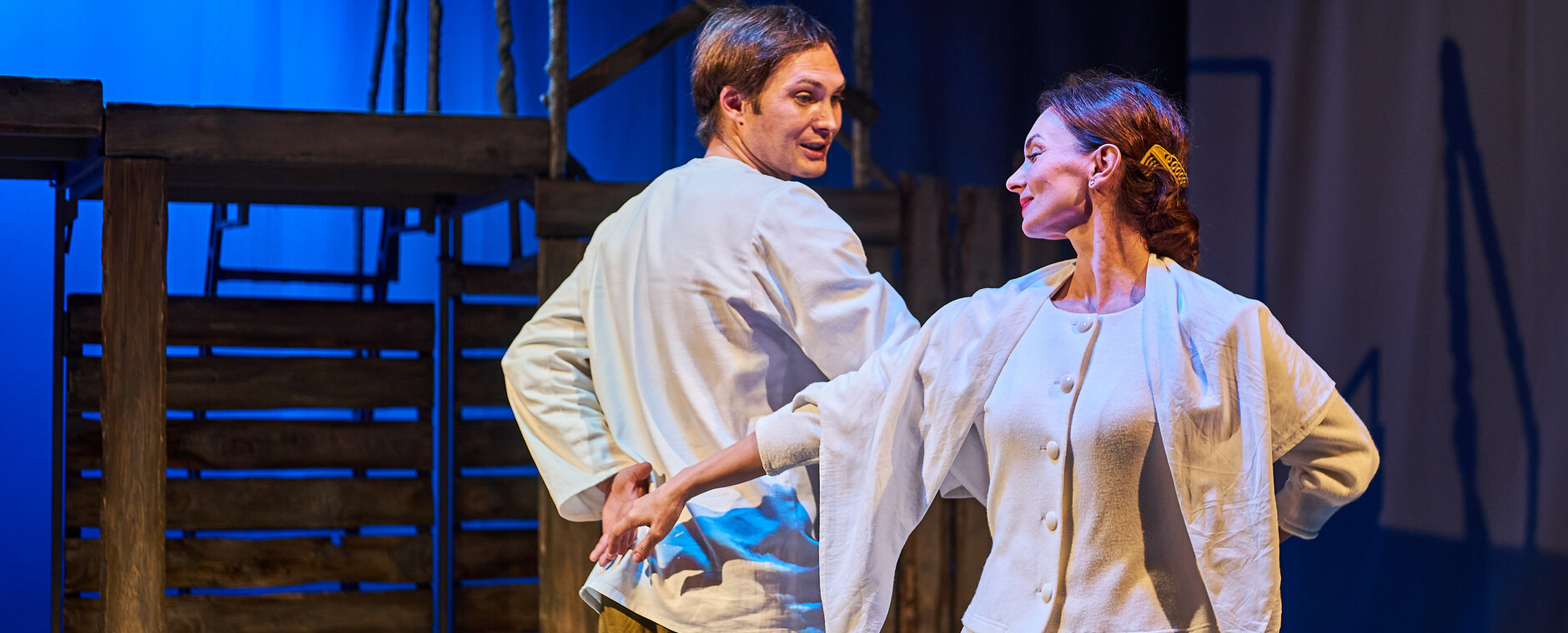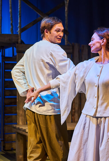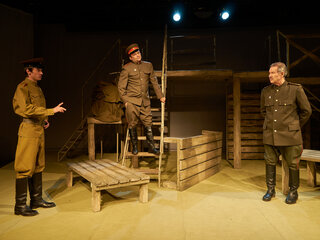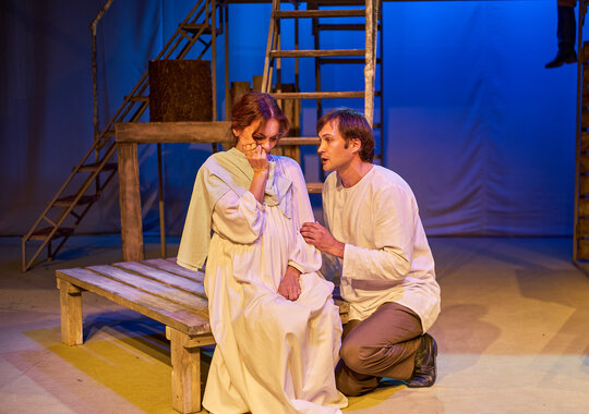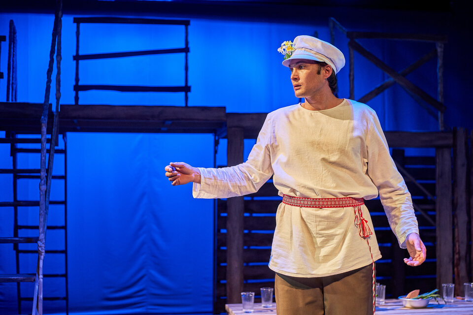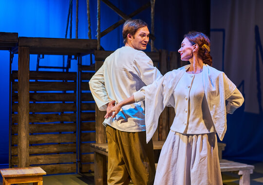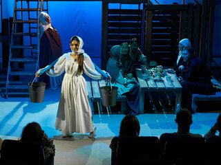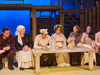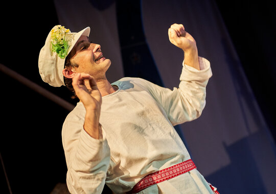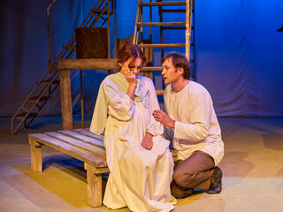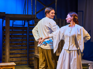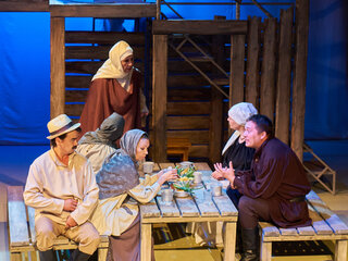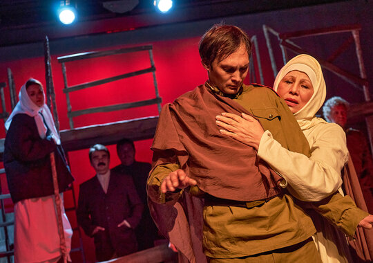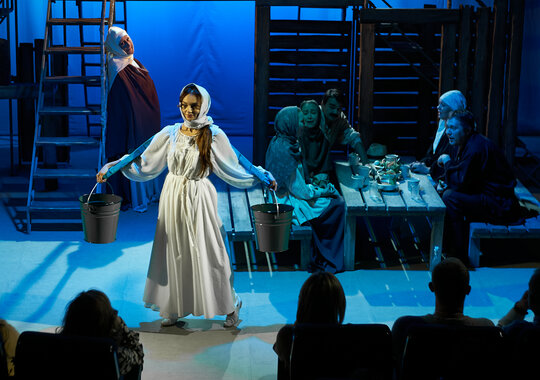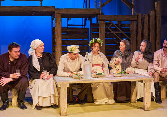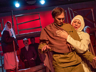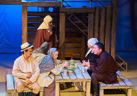 Спектакль «Синяя-синяя речка» посвящён 75-летию победы в Великой Отечественной войне. Но зритель не увидит на сцене театра сражений, не испытает высокое чувство пафоса, да и сама война здесь проходит фоном, где-то далеко. На первый план в новом спектакле Молодёжного театра выступают темы любви и непобедимости жизни. Спектакль, поставленный художественным руководителем театра Мусалимом Кульбаевым по мотивам повести Бориса Вахтина «Одна абсолютно счастливая деревня», повествует о молодой женщине, ставшей вдовой в самом начале войны. Солдат возносится на небо и оттуда ведет мистический диалог со своей женой…