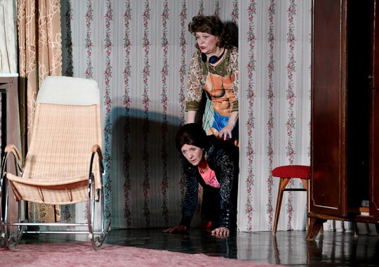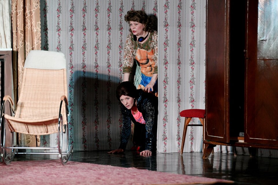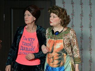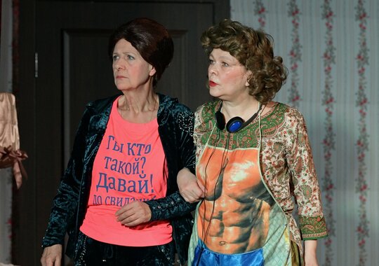 Спектакль «Тётки» — это комедия-фарс, очень лёгкая и простая. Рассчитана она в первую очередь на зрителя, который пришел в театр отдохнуть от своих повседневных забот. Сюжет таков: две сестры пенсионного возраста живут вместе в старинном красивом доме, который достался им в наследство. Дом не простой, а имеющий историческую ценность. Он расположен в самом центре города, поэтому заполучить его пытаются местные чиновники, которые хотят под предлогом программы ветхого жилья выселить бабушек на окраину города, а особняк продать. На этом фоне и развивается сюжет уморительно смешной комедии с забавными ситуациями.