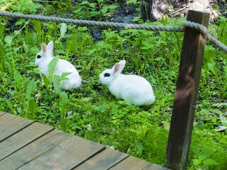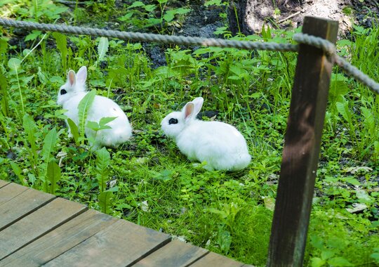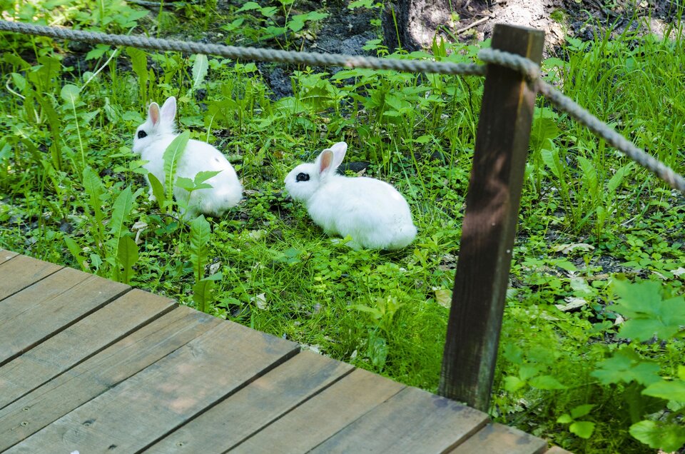 На территории тематического парка есть вольеры с живыми алтайскими белками, а по парку бегают кролики. Наш парк находится среди деревьев, в жаркие дни у нас всегда прохладно.