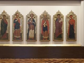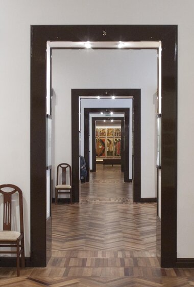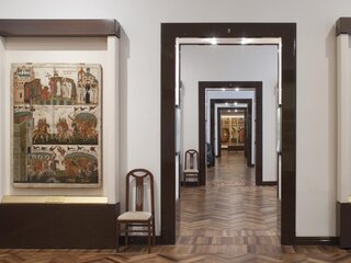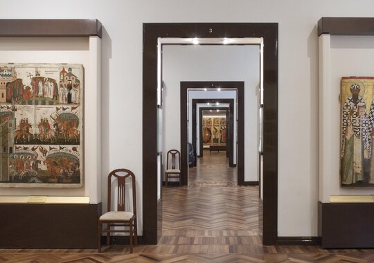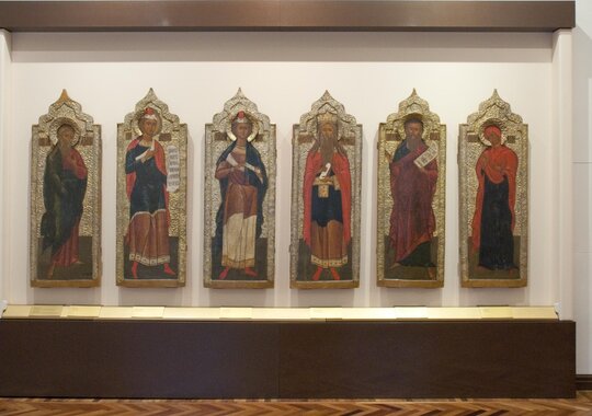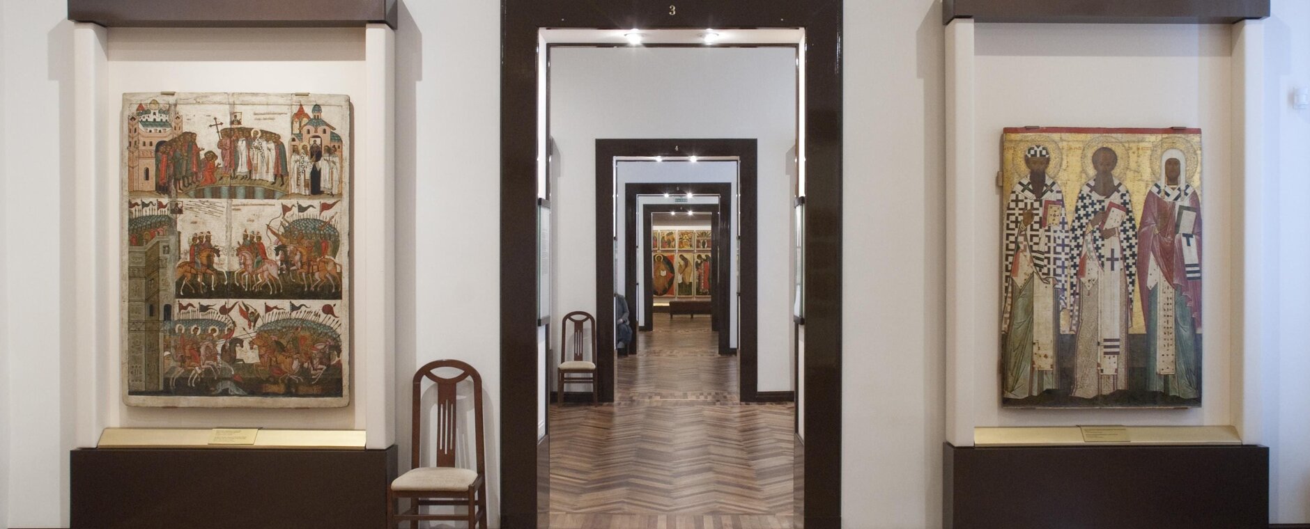 В двух залах экспонируются выдающиеся по своим художественным достоинствам и почти полной сохранности ансамбли новгородских иконостасов середины XVI в. — церкви Апостолов Петра и Павла в Кожевниках и собора Рождества Богородицы Антониева монастыря.