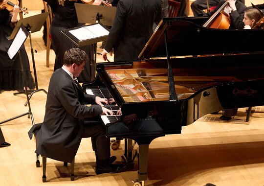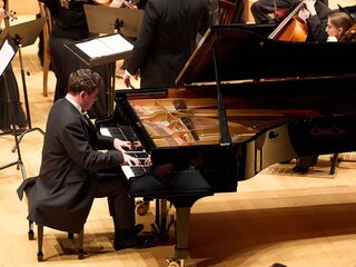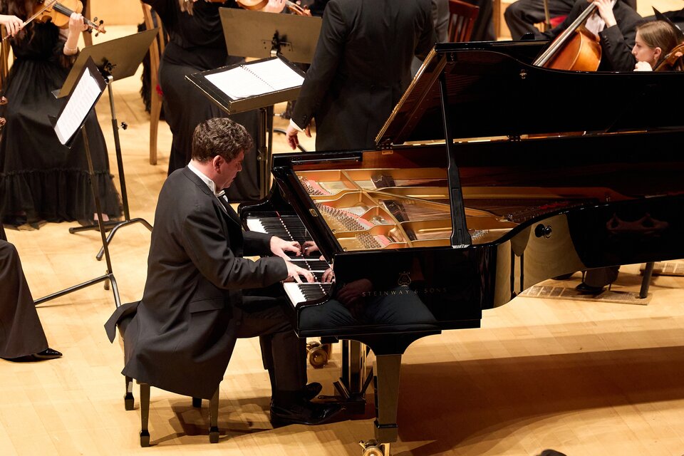 Вместе с Денисом Мацуевым на сцене — Павел Милюков и его поющая скрипка, а также Александр Рамм, виолончель которого слушатели воспринимают как продолжение его рук.