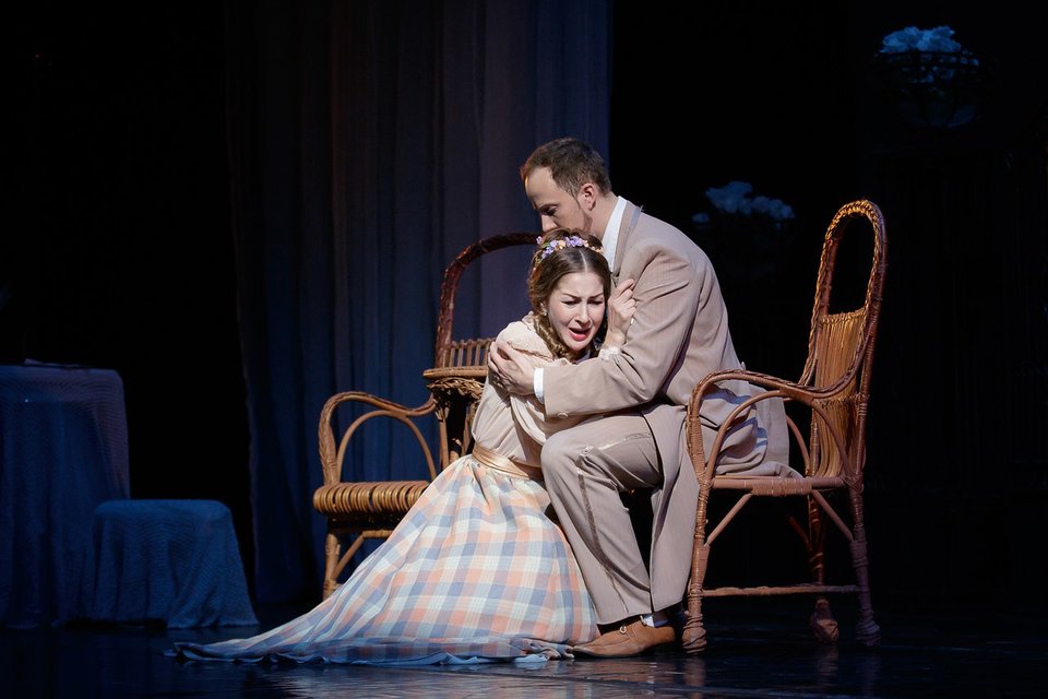В екатеринбургском спектакле режиссер Алексей Степанюк развернул действие в условных бальных залах и гостиных, не злоупотребляя страстью к бытовым деталями, но подчеркивая вневременную эмоциональную природу музыки — в расчете на то, что происходящее не будет выглядеть лишь частным происшествием прошлого, но станет по-человечески задевать тех, кто находится в зале.