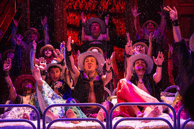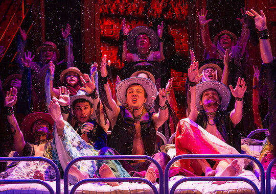 Николай Коляда создал оригинальную пьесу по мотивам знаменитой «Пиковой дамы». Драматург оттолкнулся от фразы Пушкина о том, что Германн был обрусевшим немцем. Пьеса написана на двух языках – на немецком и на русском, при этом зрители, не знающие немецкого, будут всё понимать – так построены диалоги. Актёры выучили огромное количество текста на немецком языке, который звучит в спектакле практически как музыка. Персонажи спектакля говорят по-немецки: кто-то лучше, кто-то хуже, и все восторгаются Германией, где они никогда не были, но для них она – земля обетованная. При этом все костерят Россию: и плохая она, и глупая, но вот парадокс – жить можно только здесь, на Родине, а отдыхать и развлекаться на время – все отправляются туда, в Европу. Согласитесь, знакомая и очень современная ситуация. Но не только в этом созвучна времени «Пиковая дама» «Коляда-театра».