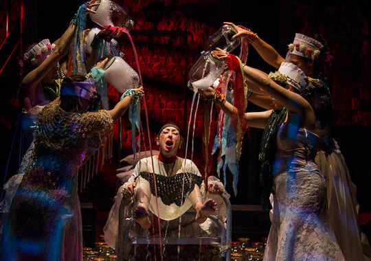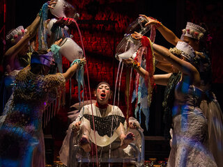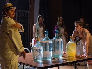 Сам текст классического произведения полностью вошёл в пьесу и практически остался неизменным. Наверное, именно так современные диджеи меняют ритм и аранжировку старых песен, добавляют повторы наиболее значимых строк. Но образные решения и неожиданные мизансцены, «добавленные» режиссёром, заставляют видеть прочтённые в школьные годы строки совсем по-другому. В этом спектакле соединены современные ритмы и старинные русские романсы. У героев весьма странные костюмы, а в декорации – не менее странные трехлитровые банки (их сто штук на сцене) с белой пеной внутри. Что в них: наркотик, сладкая вата?