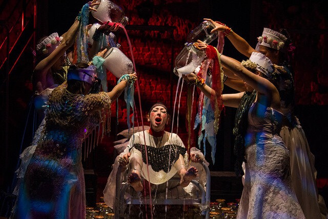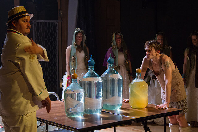 Сам текст классического произведения полностью вошёл в пьесу и практически остался неизменным. Наверное, именно так современные диджеи меняют ритм и аранжировку старых песен, добавляют повторы наиболее значимых строк. Но образные решения и неожиданные мизансцены, «добавленные» режиссёром, заставляют видеть прочтённые в школьные годы строки совсем по-другому. В этом спектакле соединены современные ритмы и старинные русские романсы. У героев весьма странные костюмы, а в декорации – не менее странные трехлитровые банки (их сто штук на сцене) с белой пеной внутри. Что в них: наркотик, сладкая вата?