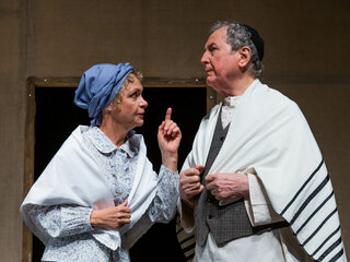 Не потерять себя, не потерять веру в Бога, веру в людей. Не утратить способность сострадать — несмотря на беды, пришедшие в собственный дом, чувствовать и чужую боль. Вот такой тяжкий путь придется пройти главному герою пьесы — Тевье-молочнику. И пьеса, и спектакль пронизаны состраданием и той целительной самоиронией и иронией, которые соединяют возвышенное с обыденным, печальное со смешным. Вспоминается старая еврейская шутка: «Скрипач на крыше — это Шагал? Нет, скрипач на крыше — это еврей, который всегда немного ближе к богу, чем сама крыша...».