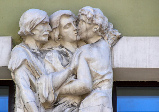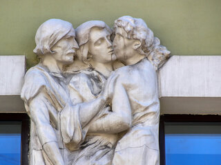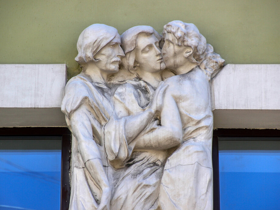 — Странный доходный дом Бройдо с горельефами целующихся писателей.