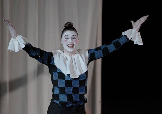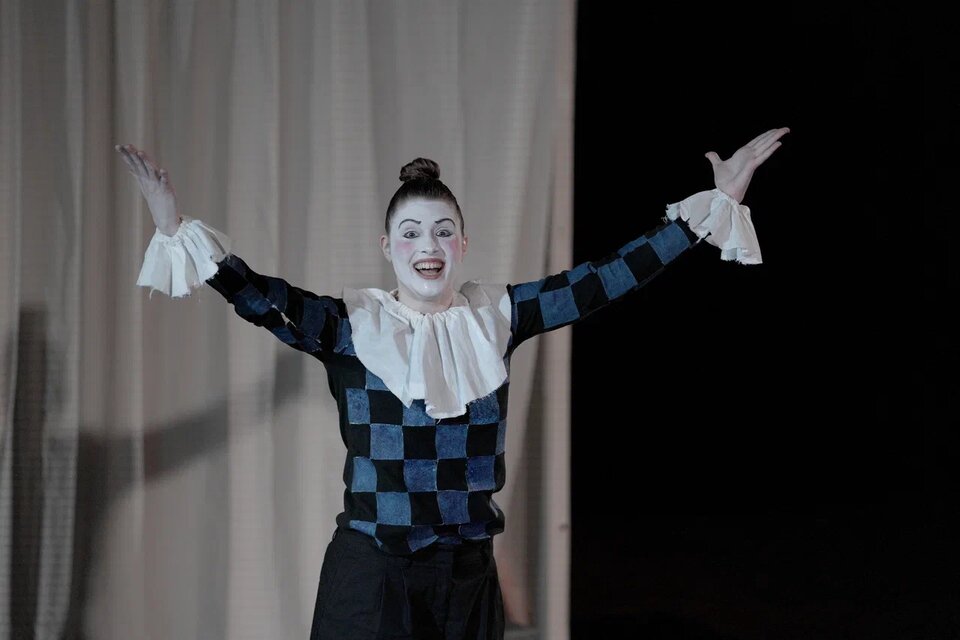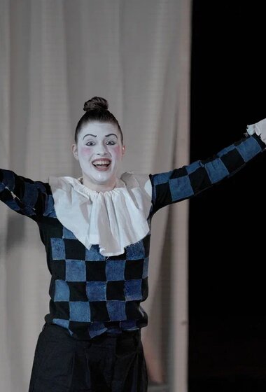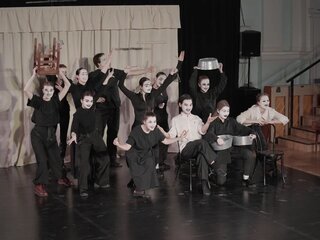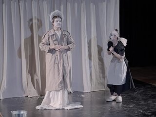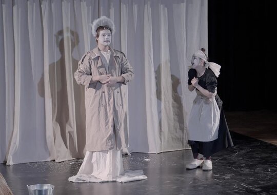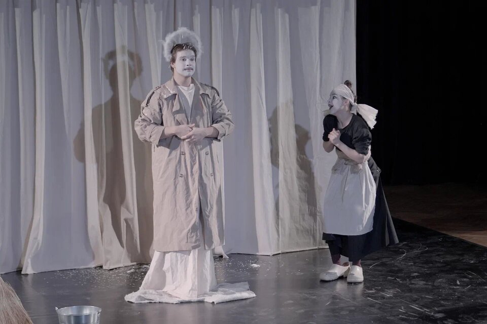 Как ученица Вахтанговской школы, режиссёр спектакля Маша Щеглова обратилась к пьесе, которой сам Вахтангов официально открыл Третью студию МХТ, позднее ставшую театром его имени. В нашей интерпретации сюжет известной пьесы исполняет труппа артистов бедного передвижного театра. Гротеск, преувеличенные типажи, ситуации, доведённые до абсурда — вот куда стремилась команда спектакля. «Наш спектакль о том, как персонажи определяют норму. Герои уверены: они нормальные, а все непохожие — либо мошенники, либо безумцы.» В спектакле задействованы студенты 4-го курса актёрского направления Московского Международного Университета и студенты 4-го курса театральной режиссёрско-актёрской лаборатории Московской школы нового кино. Мастера курсов Ю.В.Муравицкий и С.В.Михалищева. Морис Метерлинк , перевод Н.Минского и Л.Вилькиной Фантастический фарс в двух действиях.